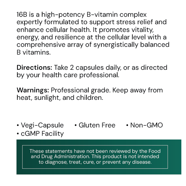 16B is a high-potency, allergen-free, yeast-free formula that combines a comprehensive range of B vitamins with a carefully selected herbal matrix. This unique combination enhances the natural assimilation and utilization of B vitamins at the cellular level, while supporting stress relief and promoting overall vitality.