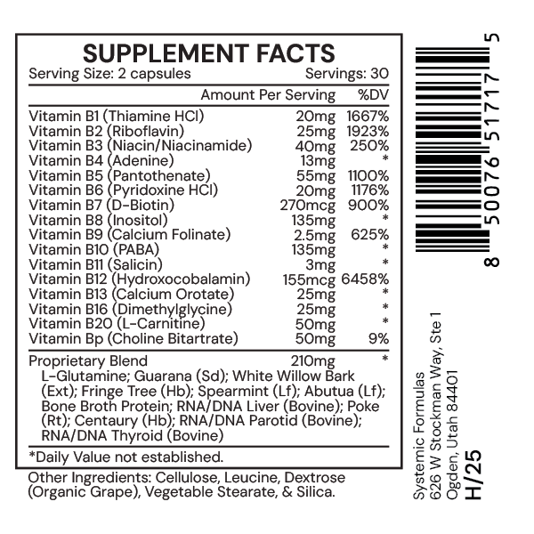 16B is a high-potency, allergen-free, yeast-free B-vitamin complex, expertly formulated to support stress relief and enhance cellular health. Designed by Dr. Shayne Morris, this herbalomic™ formula incorporates the latest research on cellular metabolic processes, showcasing how B vitamins work synergistically to optimize the body’s natural functions. To further enhance effectiveness, 16B features a carefully selected herbal matrix that supports cellular epigenetic processes, helping the body adapt to the daily challenges of modern life. Packed with a comprehensive array of synergistically balanced B vitamins, 16B is intended for daily use to promote vitality, energy, and resilience at the cellular level.