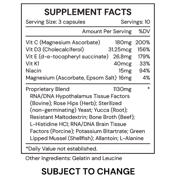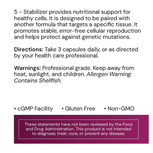 5 – Stabilizer is formulated to support the body’s natural cellular replication processes, ensuring healthy mitosis and maintaining the integrity of RNA and DNA sequences. Proper cell division is essential for overall health, as errors in replication can be influenced by viral interference, damaged telomeres, and exposure to ionized and non-ionized radiation. This formula provides key nutrients that promote stable, error-free cellular reproduction, helping to protect against genetic mutations and structural instability. By supporting the body’s intrinsic repair mechanisms, 5 – Stabilizer aids in maintaining youthful, resilient tissue and optimal cellular function.