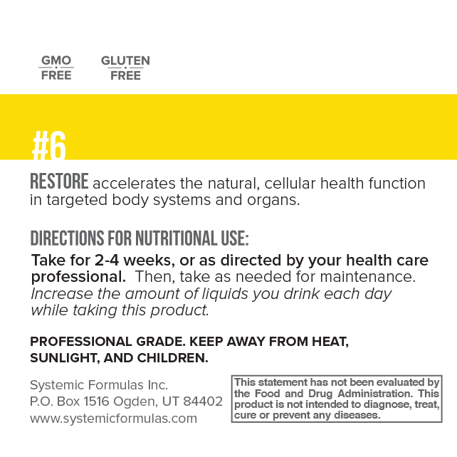 6 – Restore is a formula designed to support the body’s natural cell repair and healing processes. It provides essential nutrients to help cells recover from daily wear and tear, environmental stress, and damage from radiation and toxins, promoting overall cellular health and restoration.