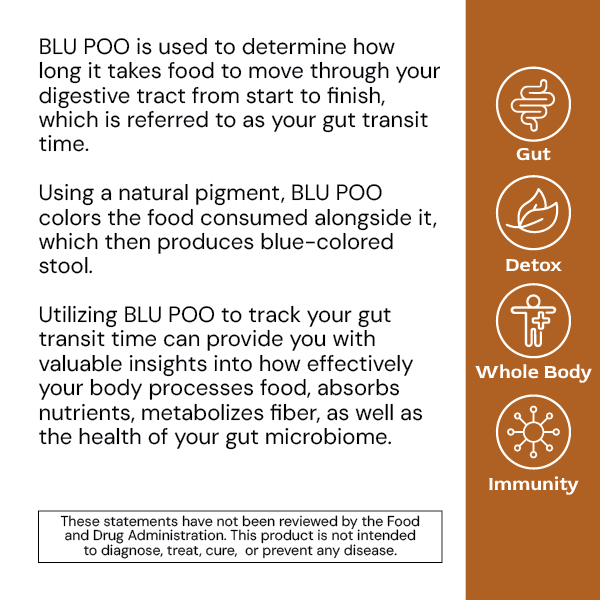 Taking BLU POO with a meal ensures that the natural pigment in BLU POO colors the food consumed alongside it, facilitating the tracking of gut transit time by producing blue-colored stool during digestion. This method provides accurate insights into how efficiently your body processes food and absorbs nutrients.