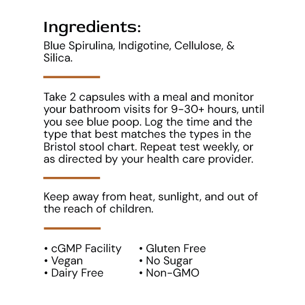 Take 2 capsules with a meal and monitor your bathroom visits for 9-30+ hours, until you see blue poop. Log the time and the type that best matches the types in the Bristol stool chart. Repeat test weekly, or as directed by your health care provider.