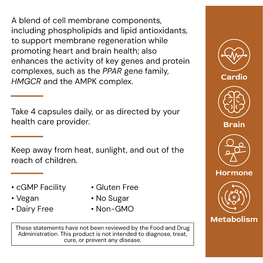 CellGenic supports membrane integrity through its unique blend of phospholipids, lipid antioxidants, and essential fatty acids like pentadecanoic acid. These ingredients work together to improve membrane fluidity, protect against cellular leakage, and support the overall structure and function of cellular membranes. This nourishment helps maintain healthy, resilient cell membranes, which are critical for optimal cellular health and performance.