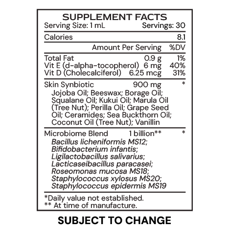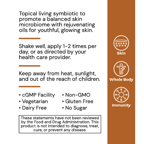 Derma Serum balances the skin microbiome by incorporating topical probiotics into its oil-based formula. These probiotic species, including exclusive strains like Staphylococcus epidermidis MS19, Roseomonas mucosa MS18, and Staphylococcus xylosus MS20, remain viable, helping reintroduce beneficial species to the skin. This promotes a balanced microbiome, regulates immune responses, reduces inflammation, and supports overall skin health, while also addressing conditions like acne, rosacea, psoriasis, and more. The synbiotic blend also includes a rich assortment of oils and nutrients that help the beneficial bacteria in our skin microbiome thrive.