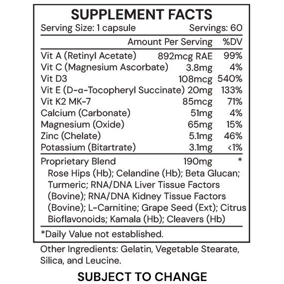 Vitamin D3 must be activated by the kidneys and liver to be fully effective. Many people struggle with this activation due to stress, poor diet, or age-related decline. DV3 includes RNA/DNA tissue factors to support these organs, helping to ensure that vitamin D3 is properly metabolized and can perform its vital functions in bone health, immunity, and cellular function.