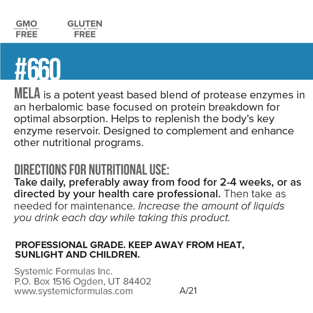 MELA is a powerful enzyme and herbal matrix formula designed to support a wide range of cellular processes, focusing on digestion, inflammation management, and blood purification. Enzymes act as crucial catalysts for cellular life, and MELA’s protease enzyme blend, combined with supportive herbs, helps break down inflammatory protein byproducts that can trigger allergy-immune responses. This formula also supports blood vessel integrity and promotes overall blood purity. By assisting the body’s natural anti-inflammatory processes, MELA helps maintain a healthy gastrointestinal microbiome and robust immune system. It can alleviate general discomfort, body aches, and malaise often associated with enzyme depletion, effectively replenishing the body’s enzyme reserves. Recent research highlights the role of proteolytic enzymes in disrupting undesired microbial biofilm colonies in the intestines. Clinicians frequently utilize MELA alongside Enzee as “biofilm busters” in comprehensive gut microbiome cleansing programs, emphasizing its role in promoting a balanced and healthy gut environment.