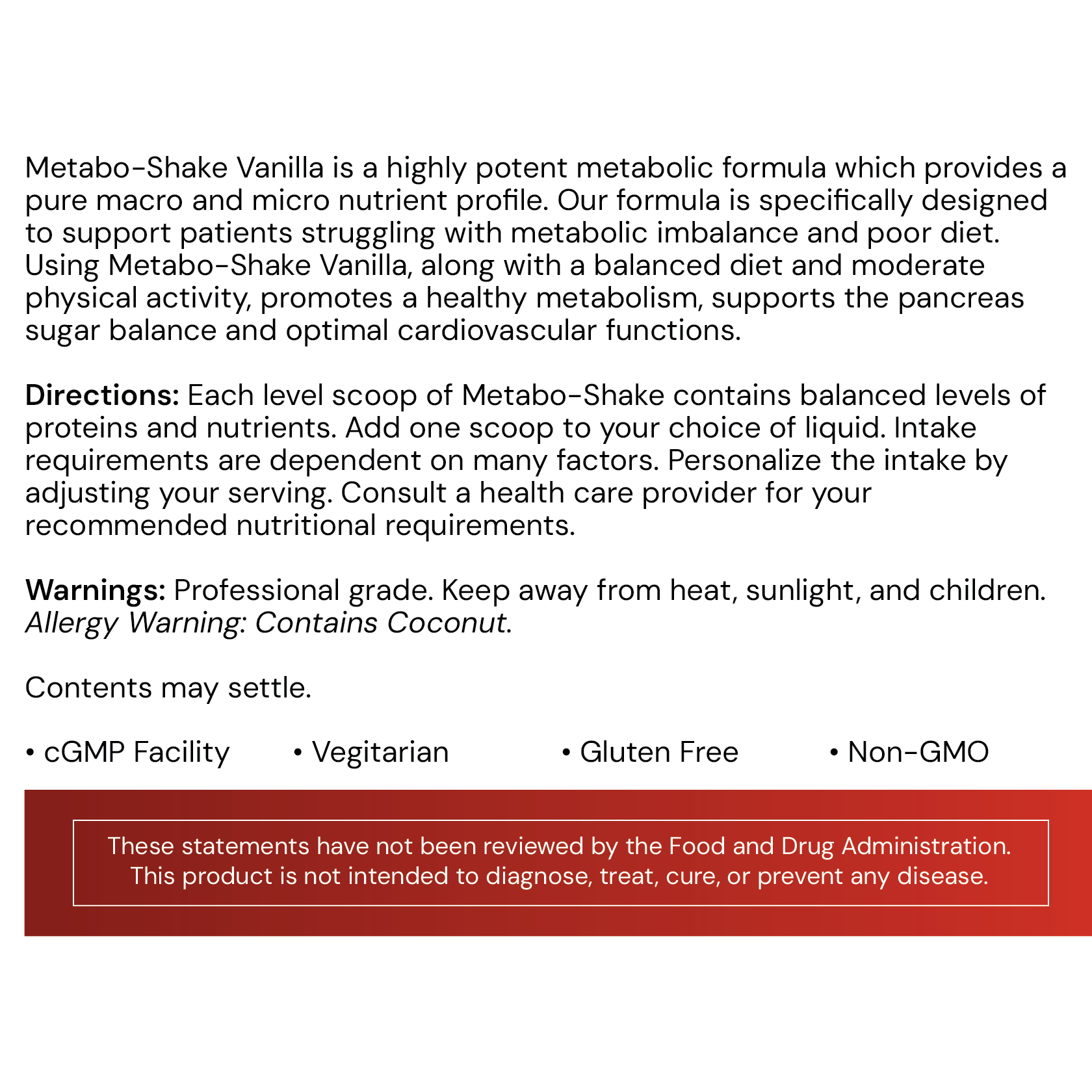 Vanilla Metabo-Shake is a highly potent metabolic formula which provides a pure macro and micro nutrient profile. Our formula is specifically designed to support patients struggling with poor diet. Using Metabo-Shake along with a balanced diet and moderate physical activity promotes a healthy metabolism, supports the pancreas sugar balance and optimal cardiovascular functions. Metabo-Shake is also a good source of potassium. Diets containing foods that are a good source of potassium and that are low in sodium may reduce the risk of high blood pressure and stroke.
