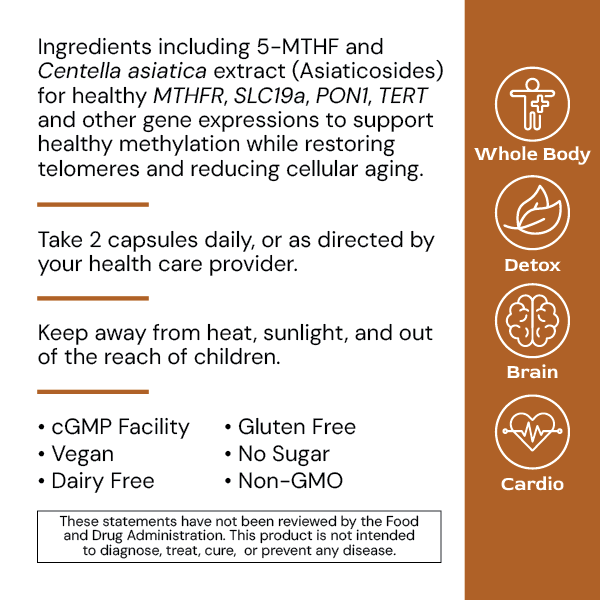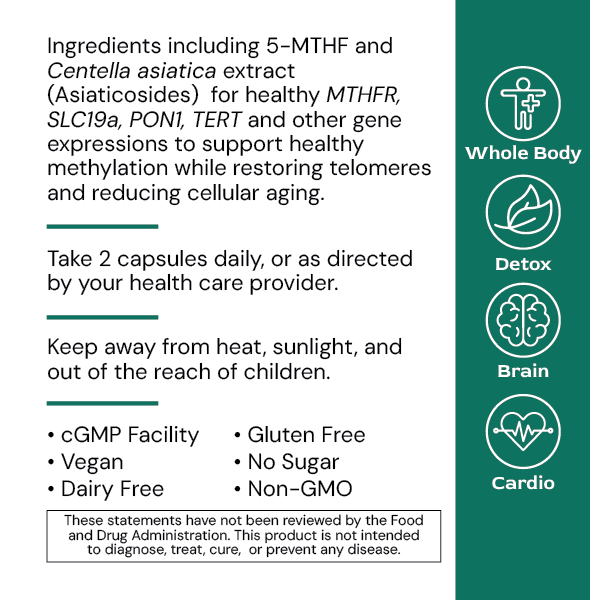 MethylGenic slows cellular aging by promoting optimal methylation, which maintains DNA integrity and regulates gene expression, while also targeting telomere preservation to promote cellular longevity. Additionally, its potent antioxidant blend helps protect cells from oxidative stress, collectively contributing to the slowing down of the aging process and promoting overall cellular health and vitality.