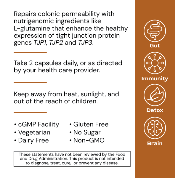 Repairs colonic permeability with nutrigenomic ingredients like L-glutamine that enhance the healthy expression of tight junction protein genes TJP1, TJP2 and TJP3.