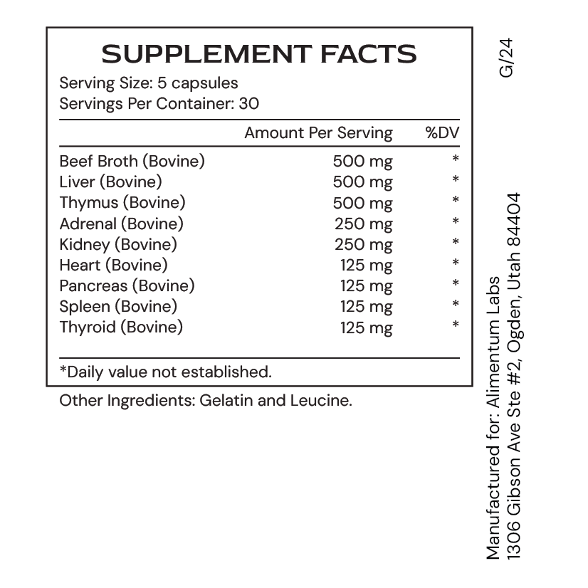 OrganGenic by Alimentum Labs is a groundbreaking blend of nutrient-rich, organ-based ingredients meticulously crafted to elevate your vitality and overall well-being. Harnessing the potent essence of nature, OrganGenic is an advanced supplement designed to invigorate your health journey. Crafted from a blend of pure bovine organ tissue extracts, also known as glandulars, this innovative formula is a potent source of DNA, RNA, and amino acids that are essential for multi-organ support.