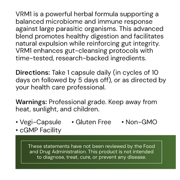 VRM1 is an essential tool for those looking to enhance gut-cleansing protocols with time-tested, research-backed herbal ingredients that work in harmony with the body’s natural processes.