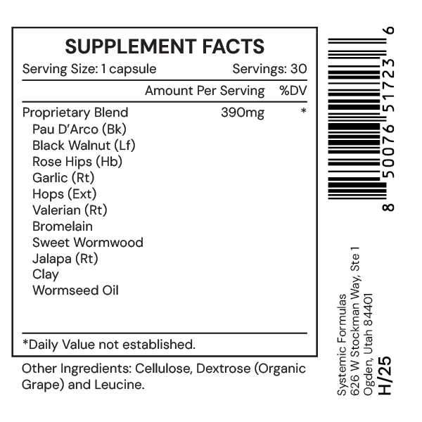 VRM1 contains a blend of botanical ingredients known for their antiparasitic properties, including black walnut, pau d’arco, garlic, wormseed oil, and bromelain. These ingredients work together to create an inhospitable environment for large parasitic organisms, support normal gut function, and enhance the body’s natural detoxification processes.