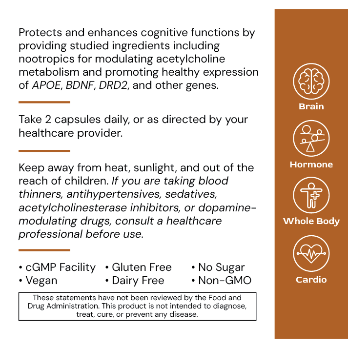 Protects and enhances cognitive functions by providing studied ingredients including nootropics for modulating acetylcholine metabolism and promoting healthy expression of APOE, BDNF, DRD2, and other genes.
